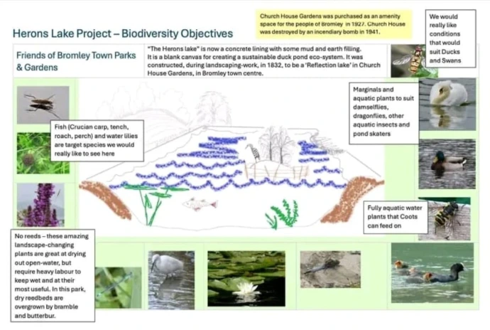 In August 2022, we campaigned and lobbied the Council for improvements to Herons Lake, Church House Gardens. This culminated in the desired funding to tidy up and augment the silt into an island to make the lake more drought resilient. We are now supporting the Friends and LBB in their bid for more substantial funding to unblock the inflow pipe and increase biodiversity.